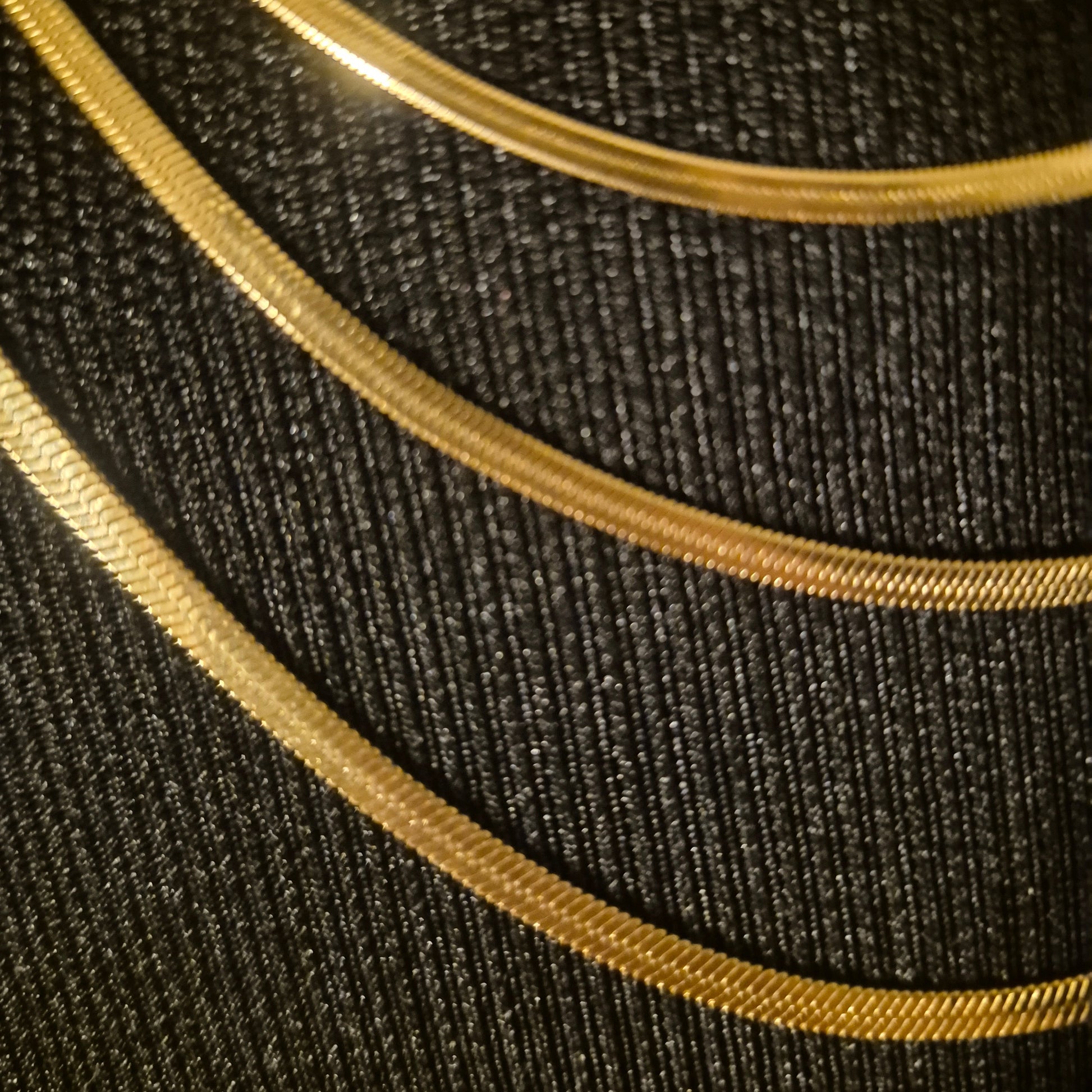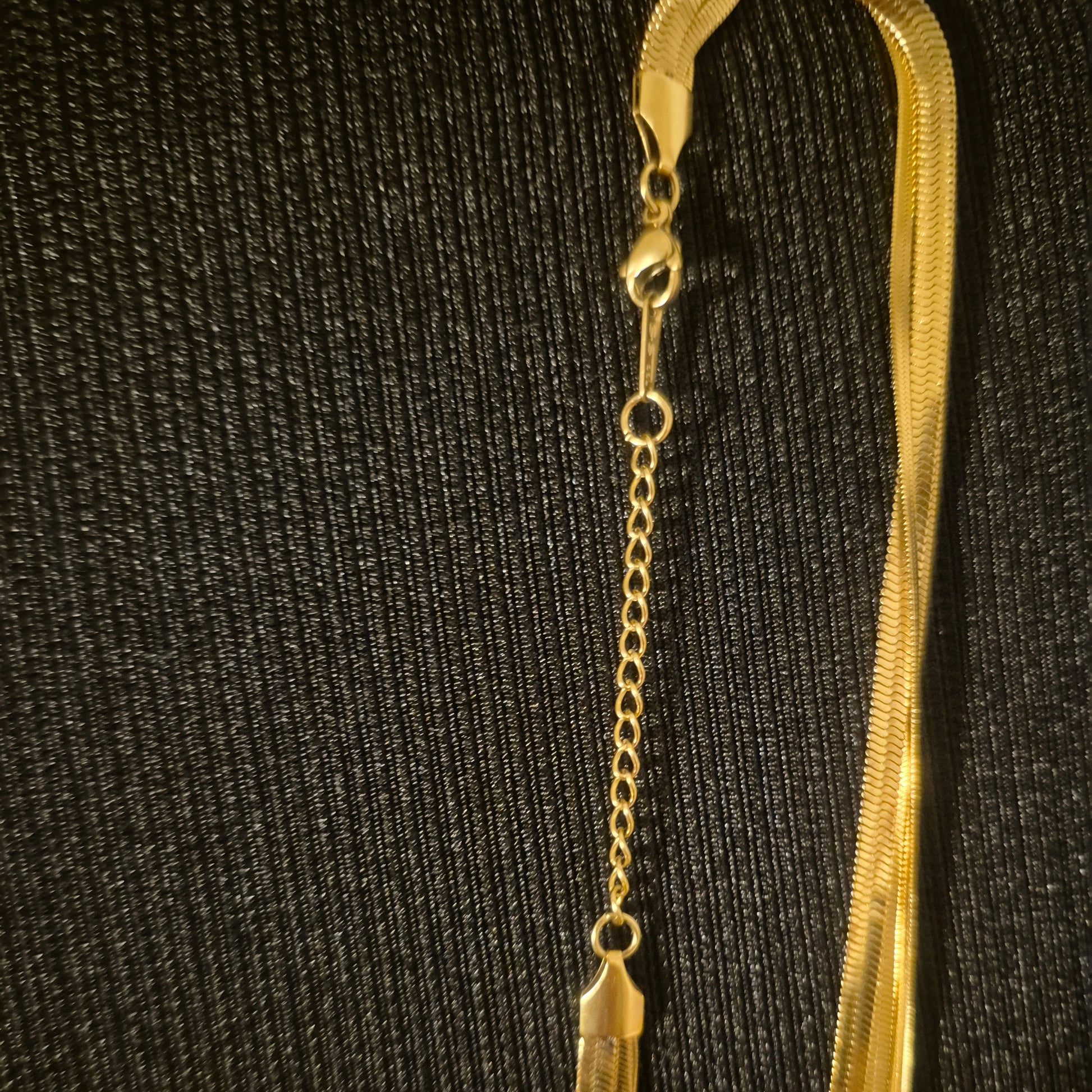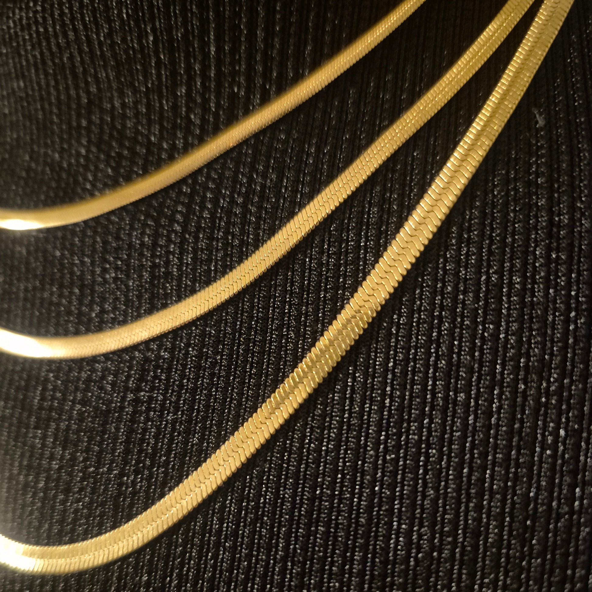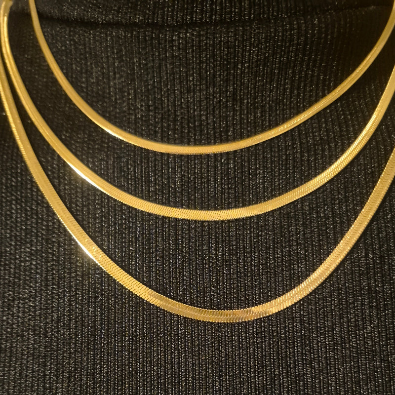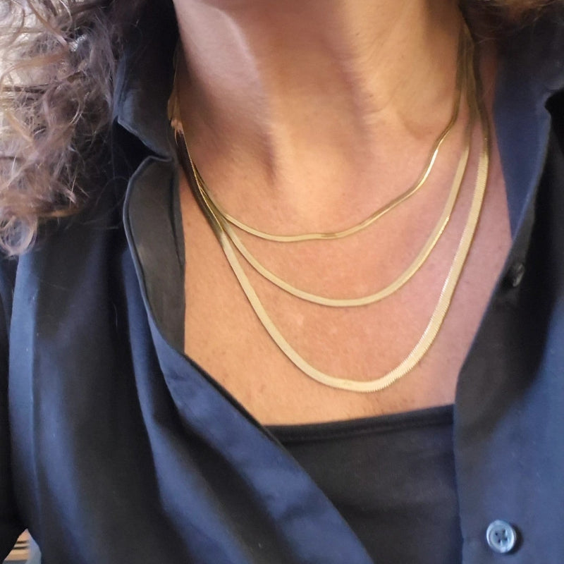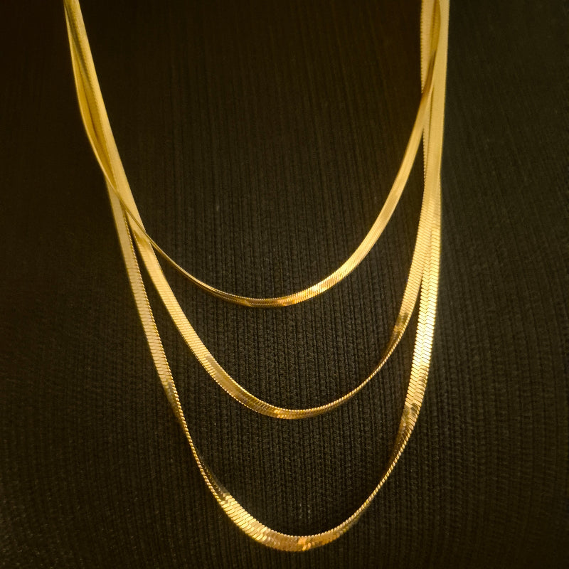 Die Halskette Asiye ist ein ausdrucksstarkes Schmuckstück für alle, die moderne Eleganz lieben. Gefertigt aus vergoldetem Edelstahl, überzeugt sie durch ihre langlebige Qualität, ihren edlen Glanz und ihre zeitlose Ausstrahlung. Die Kette besteht aus flachen Schlangen-Kettengliedern in einer stilvollen Dreier-Kombination und ist ein garantierter Blickfang, der sofort Aufmerksamkeit auf sich zieht.